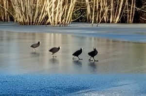 Les foulques macroules ne peuvent plus patauger dans l’étang. Ils font du patin à glace !