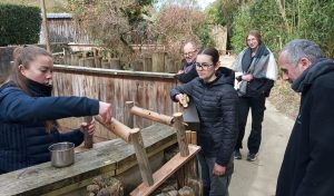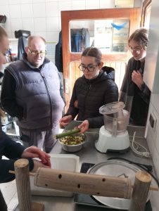 On amène notre création à la cuisine du zoo où Axelle, la soigneuse animalière, nous explique comment placer de la nourriture dans les tubes de bambou que nous avons préparés.