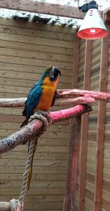 Les perroquets restent au chaud dans leur volière sous la lampe chauffante…